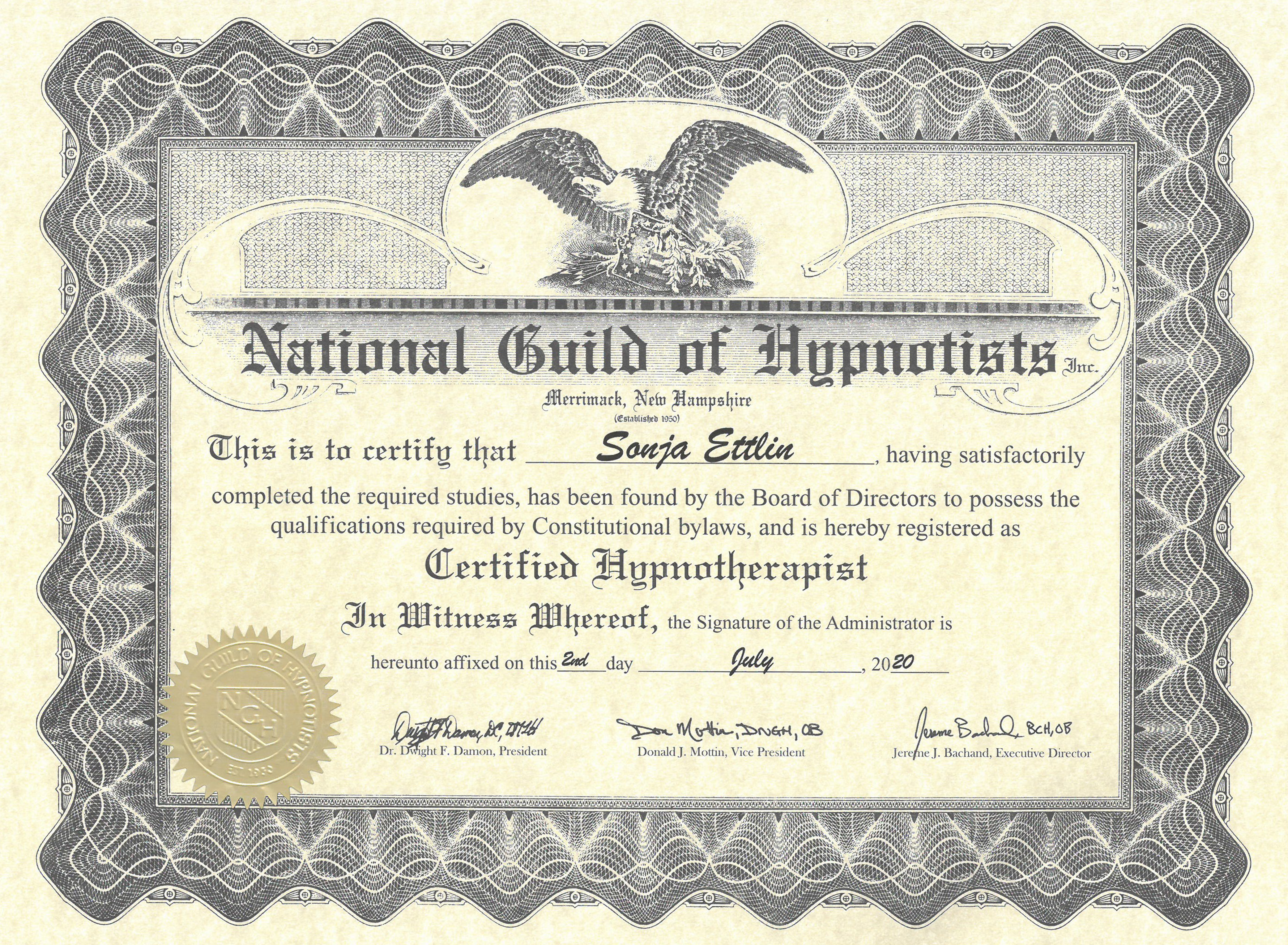 2020 dipl. zert. Hypnosetherapeutin VSH / NGH ausgebildet bei Gabriel Palacios