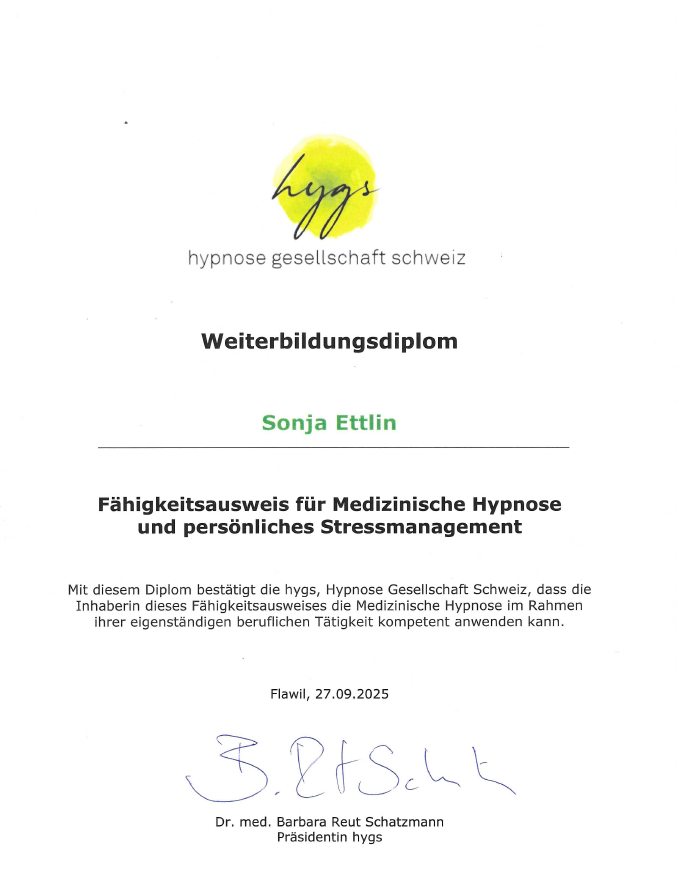 2025 Fähigkeitsausweis für Medizinisch Hypnose und persönliches Stressmanagement, by hygs (Hypnose Gesellschaft Schweiz)